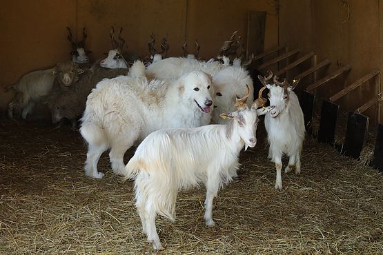 Accanto a lui alleviamo il Cane da Pastore della Sila, una rarità della cinofilia italiana che sta trovando crescente riconoscimento. Maestoso, imponente e particolarmente dinamico come cane da guardiania, esprime nel branco il massimo delle sue potenzialità. Condivide la livrea con le capre autoctone calabresi, una caratteristica che rappresenta una straordinaria convergenza evolutivo-selettiva del territorio da cui proviene.