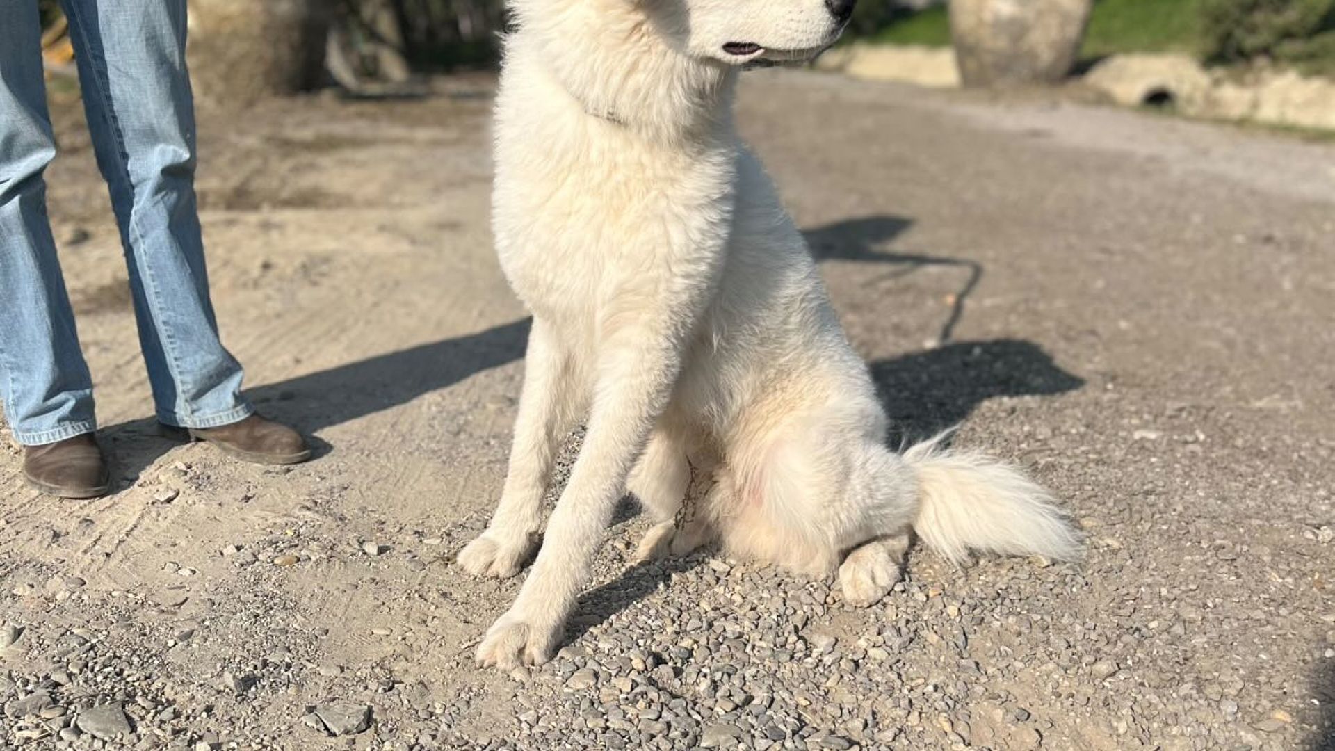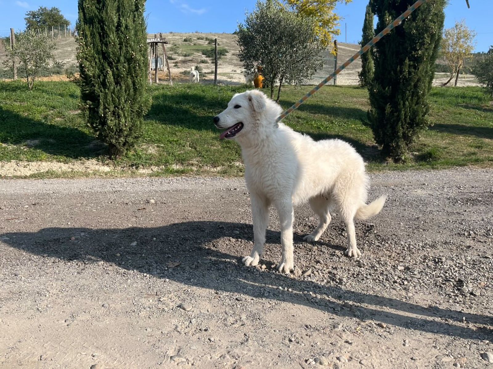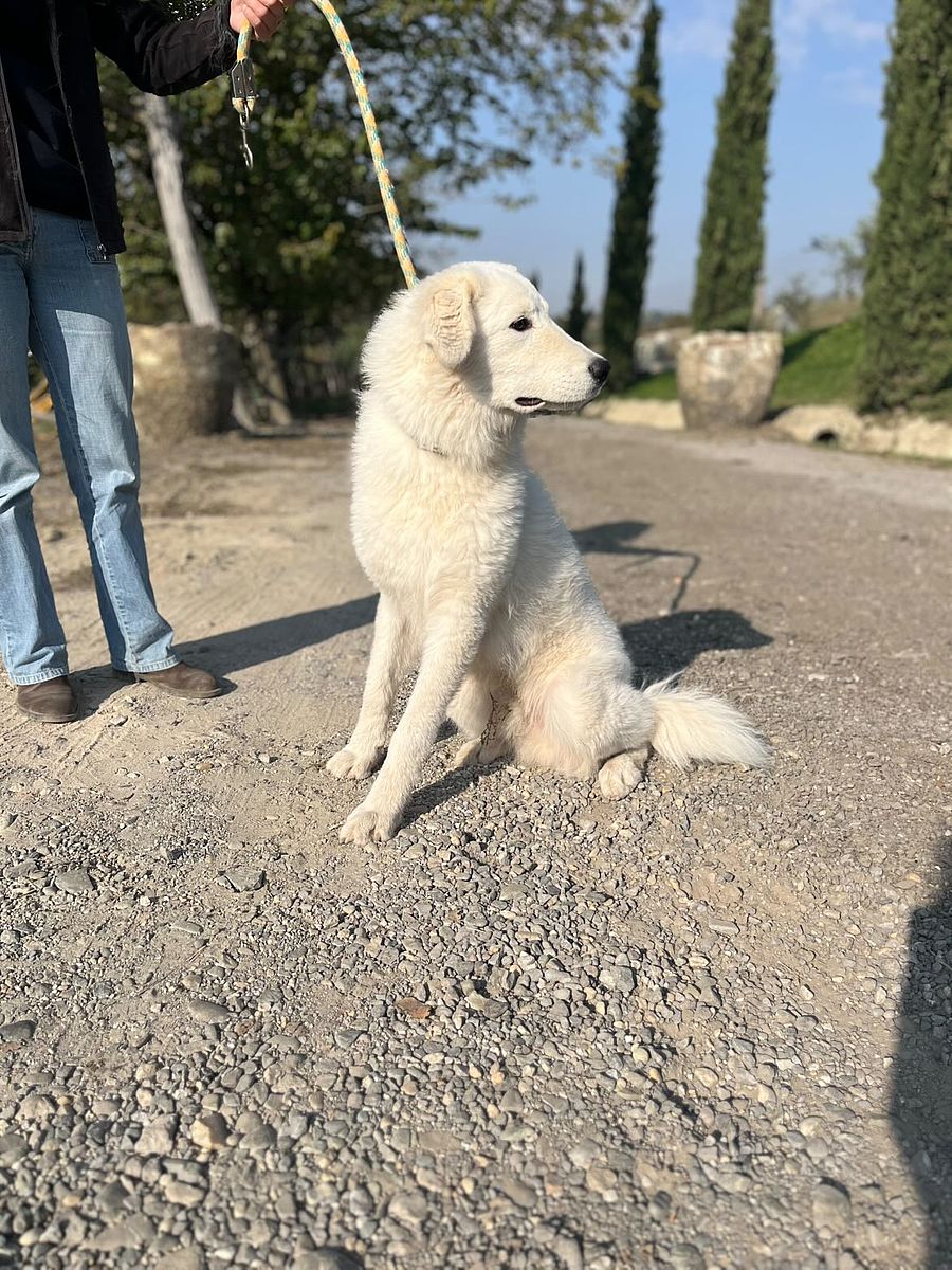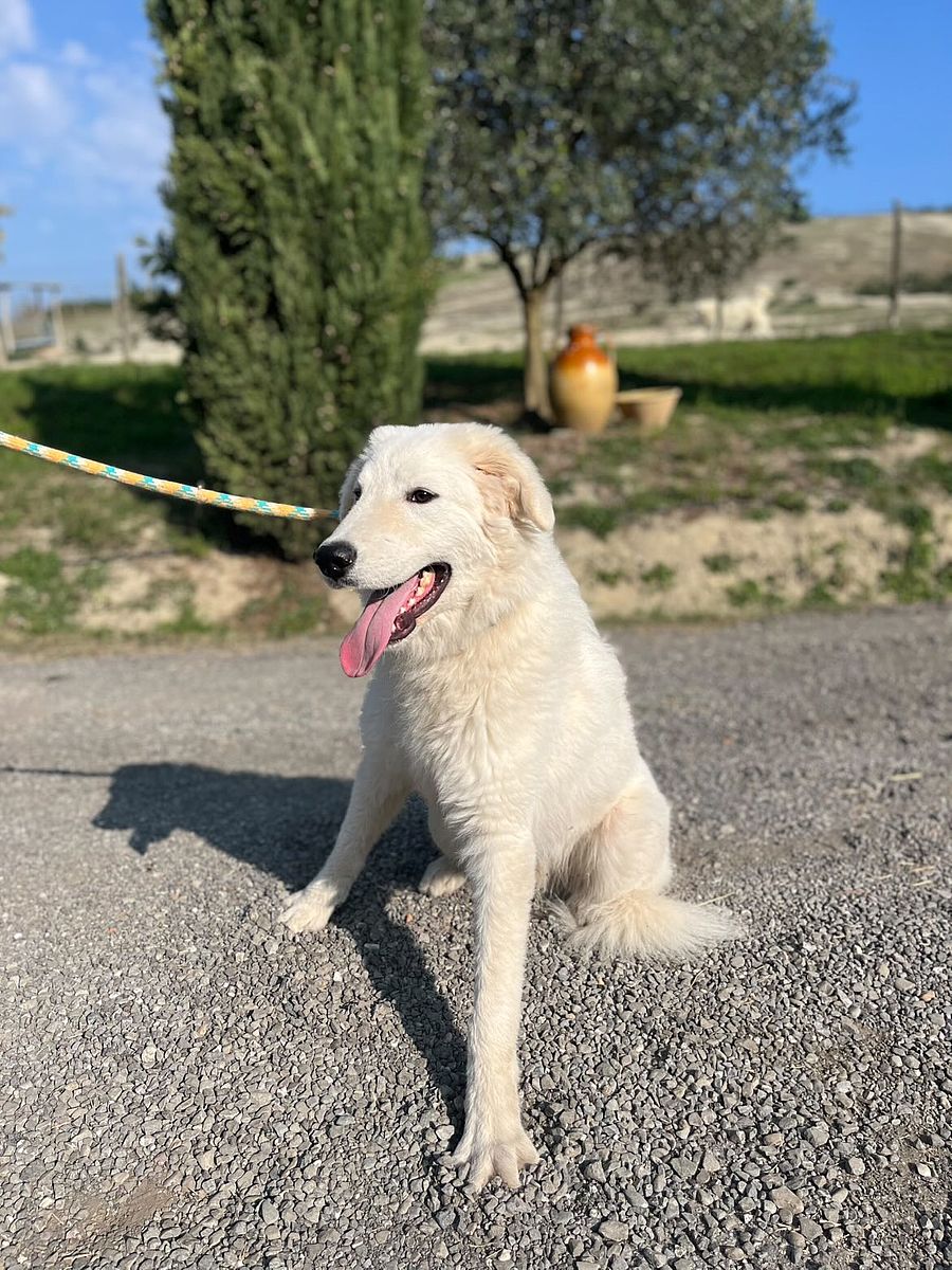 Campagnolo è un giovane pastore maremmano abruzzese di quasi un anno, cucciolone di buona mole con pelo estivo, meno folto rispetto alla stagione fredda. Mostra dentatura corretta e completa con chiusura a forbice, e i testicoli sono discesi nello scroto.